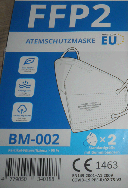 Zertifizierung: CE-zertifiziert (CE 2163) nach EN 149:2001 + A1:2009 (Chinaimport)